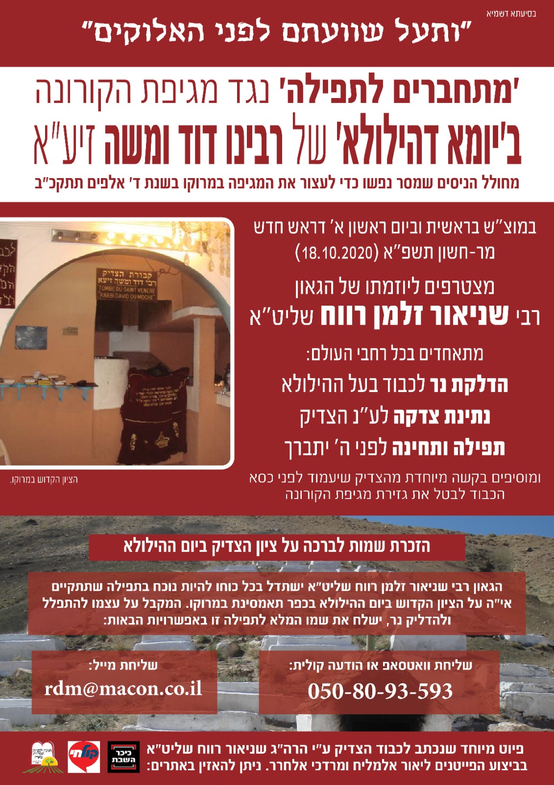 במוצאי שבת פרשת בראשית וביום ראשון א דר”ח מרחשון יומא דהילולא של רבינו דוד ומשה זיע”א שמסר עצמו למיתה כדי לעצור את המגיפה מעל כלל ישראל שבמרוקו בשנת ד אלפים תתקכ”ב